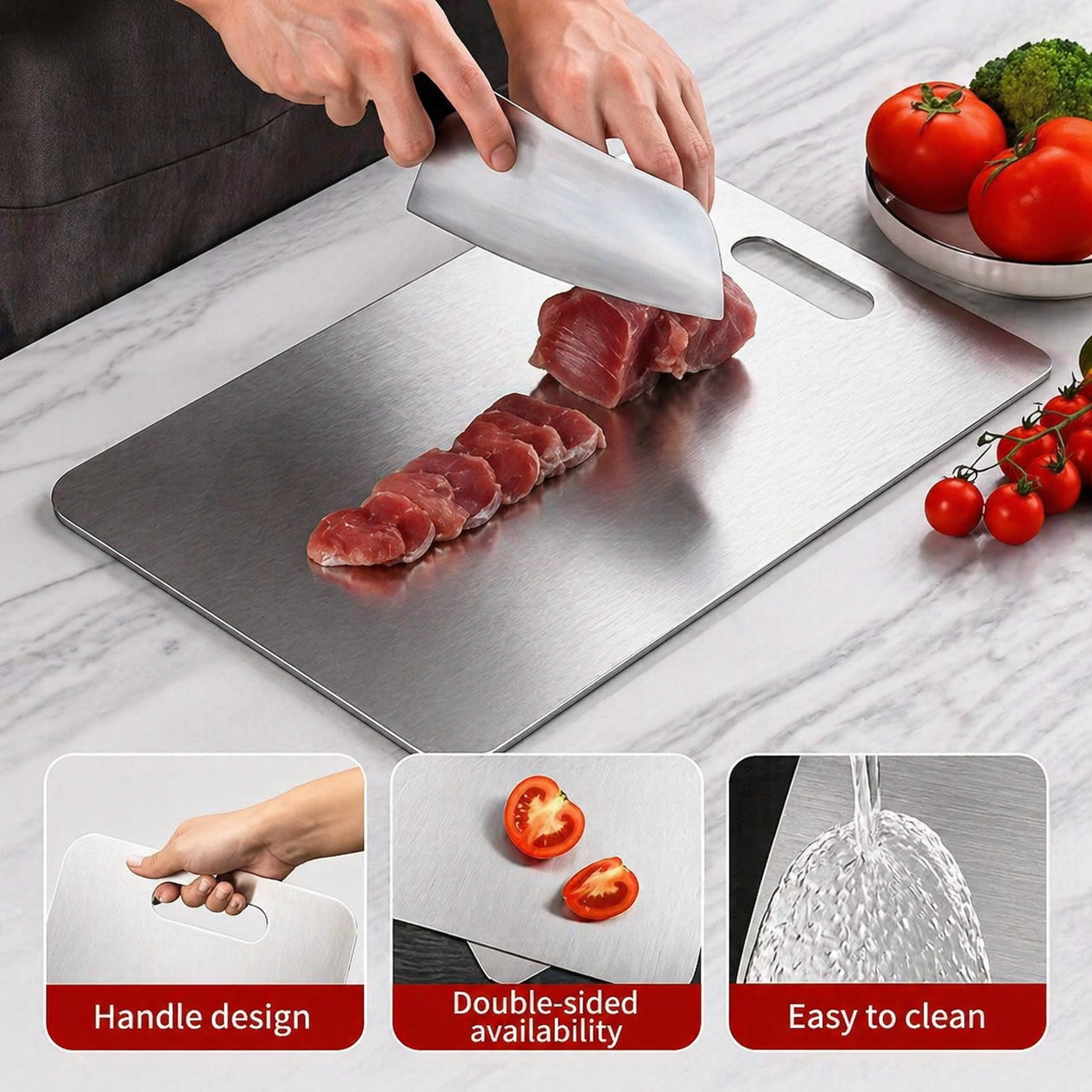 Crafted from high-quality stainless steel, cutting board set is designed to meet all your kitchen needs. Unlike traditional wooden or plastic boards, stainless steel offers superior resistance to stains, odors, and bacteria, ensuring a hygienic surface for food preparation.