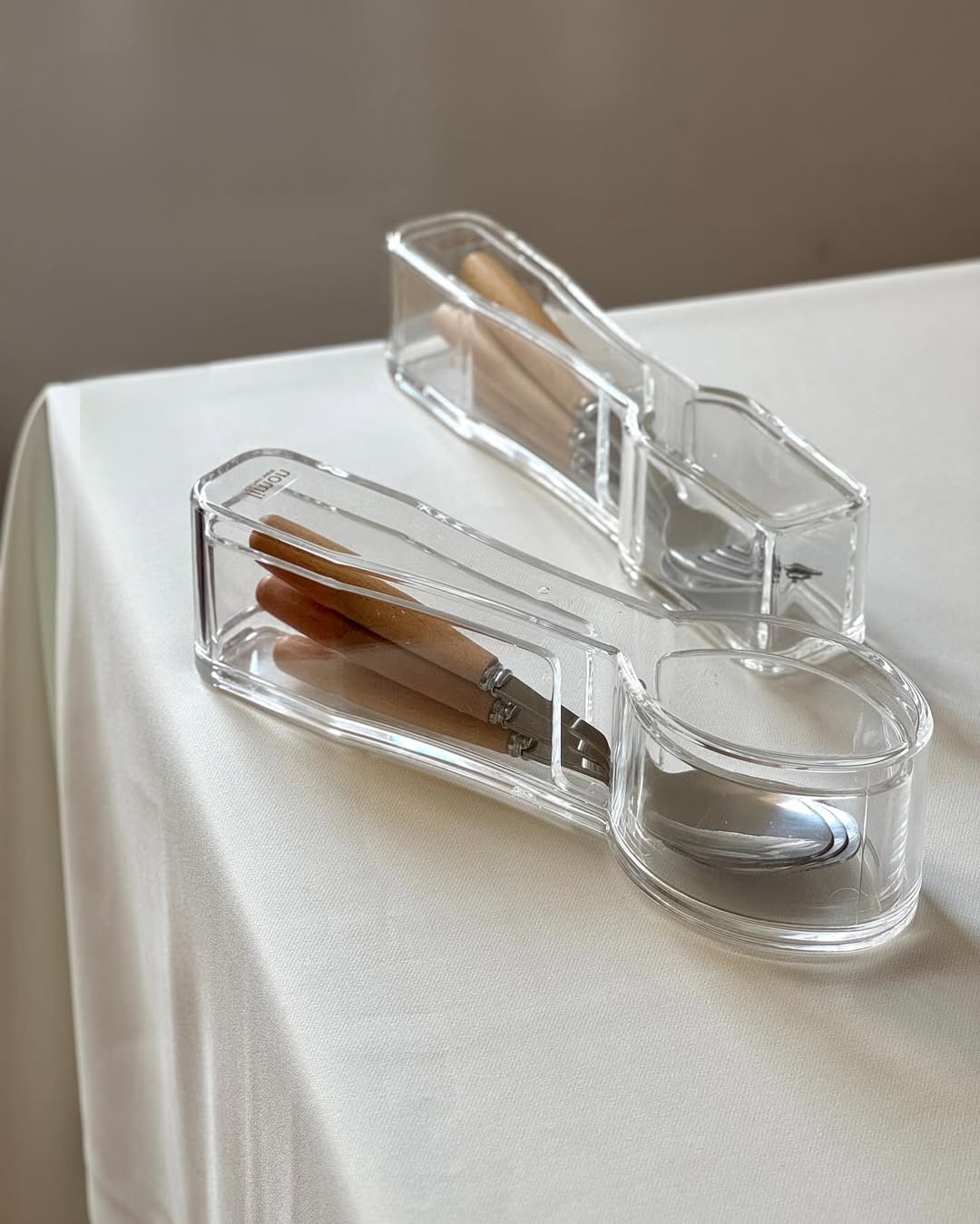 A sleek, hygienic solution for everyday cutlery. Crafted from durable, food‑grade acrylic, this two‑piece set keeps 12 utensils per spoons and forks, organized visible, and dust‑free with secure fitted lids. Compact yet spacious, it’s perfect for modern kitchens, offices, or travel use. (Made in Iran)